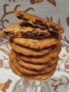 Tonight I made a new ‘classic’ (in my opinion) – it’s a Martha recipe for Chocolate Chunk Cookies from her Baking Handbook. They turned out as described, thin and buttery. And melting with chocolately goodness. I made these a few weeks ago and a few minutes after I put the last tray in the oven – the power went out! Not to fear! A few extra cooking minutes (actually…about 40) in the still-hot oven baked them to perfection. Therefore, these cookies I have nicknamed, “Blackout Cookies”. Blackout from the sugar, really.