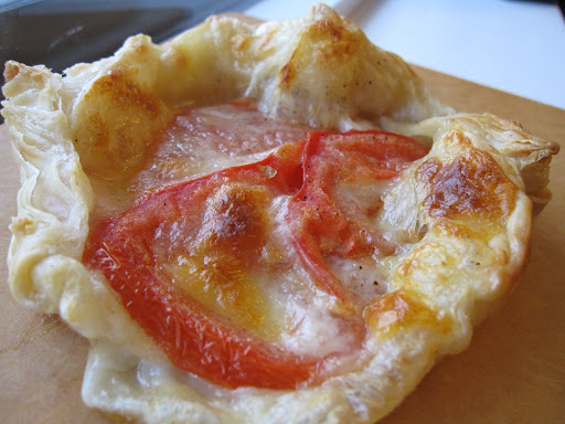 Free form tomato and mozzarella tarts! I was going to do the soup a la pot pie, but that would take too much time, and the original idea was turnovers, but I thought that tarts would be much more aesthetically pleasing. And they were!