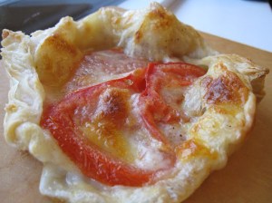 In the zucchini and carrot shared space in the Frigoverre (medium square) with half a tomato. (did I mention that I had half an apple for breakfast? I like to eat half of things and leave it for ‘later’. Which the mothership interprets as ‘never’ and most of the time tosses it in the bin – I have to literally point to the half-eaten food item and say, “I WILL return to eat this. Do not throw this half-eaten banana/apple/cookie/tomato/sandwich away”.) Also taking up real estate space in the fridge was a thawed piece of puff pastry. And some fresh mozzarella from Bosa Foods. What to do…what to do.