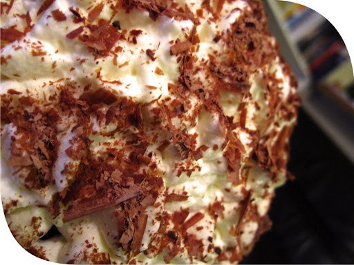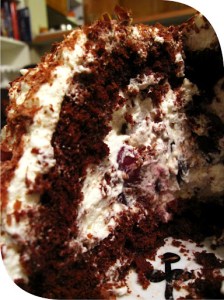 I was toying with different decorating options – obviously I was limited to something that would look good on a dome-shaped cake – and I wanted to stay away from the combed-whipped cream look, so I opted for cream piped flat with a star tip and then covered with shaved chocolate pieces. Looking back, it wouldn’t have hurt for me to spend 5 – 10 minutes to actually sketch out a decorating plan. It looked good – but not…great. Oh well – there’s always next year.