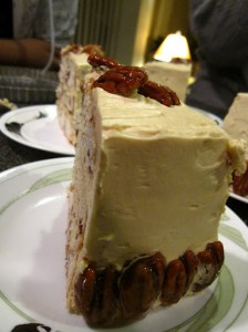 Almost forgot – the cake was decorated with candied pecans. Very easy to do – caramelize 1 cup of sugar over medium high heat until medium-amber in colour. Gently stir in 1 cup of pecans and make sure each nut is coated. Take off the heat (if you haven’t already) and CAREFULLY remove each pecan onto a parchment-lined cookie sheet. They recommended two forks. I recommend a long skewer. It’s less messy if you work quickly and doesn’t collect as much caramel build-up. Let cool 5 min and then decorate (or eat)!