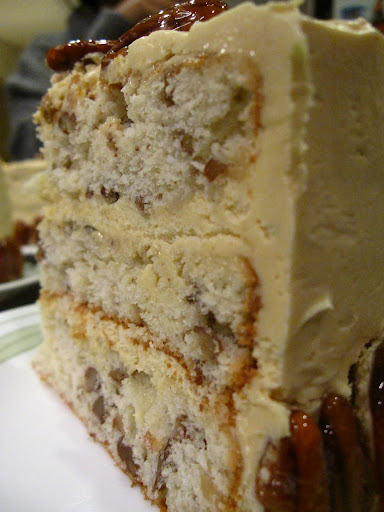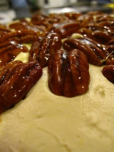 Almost forgot – the cake was decorated with candied pecans. Very easy to do – caramelize 1 cup of sugar over medium high heat until medium-amber in colour. Gently stir in 1 cup of pecans and make sure each nut is coated. Take off the heat (if you haven’t already) and CAREFULLY remove each pecan onto a parchment-lined cookie sheet. They recommended two forks. I recommend a long skewer. It’s less messy if you work quickly and doesn’t collect as much caramel build-up. Let cool 5 min and then decorate (or eat)!