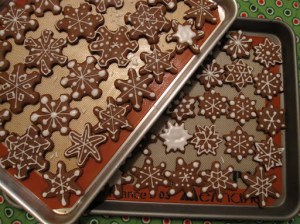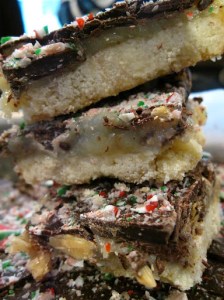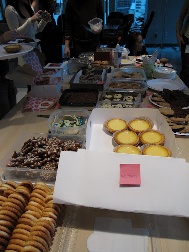 (below: my contributions to the Baking Exchange – traditional gingerbread cookies and peppermint-topped Millionaire Shortbread (shortbread topped with a caramel layer, then with chocolate, then with crunched up candy canes), also a picture of the goods others bought, we raised nearly $200 at the subsequent Bake Sale)