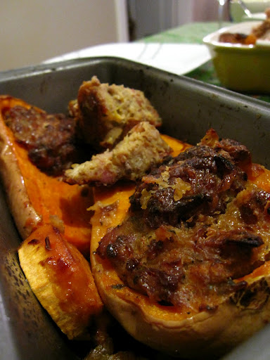 (below: Christmas dinner – I cooked and hosted the fam! Stuffing,…err…stuffed squash and to the right – roast chicken with potatoes and stuffing. In the background you can see the mountain of mashed potatoes and carrots ‘n cabbage plate.)