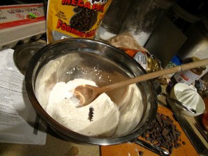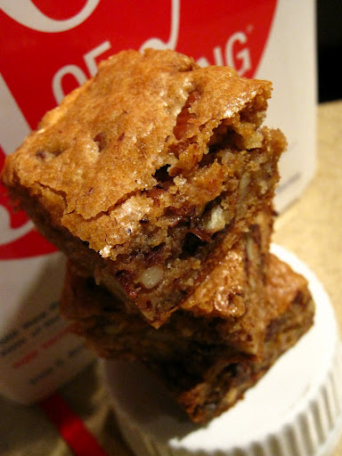 It was raining today, or I should say – it is raining today and I had a particular itch to scratch. Brownies. But I wanted to do something new (a la Kitchen Resolutions) so I dug up a recipe for blondies – the sister to the fudgy brownie. If the pastry world was like Hollywood, brownies would be Angelina Jolie and blondies would be Jennifer Aniston. The brownie is rich, luxurious, sinful, decadent, and at times, nutty. The blondie is lighter, sweeter – but is a mishmash of all different kind of nuts and chips. Cream puffs would be Jessica Simpson, of course. Light, airy, tricky to tackle at first, but SUPER-easy once you know all the shortcuts. Not to mention the gaping air pocket in the ‘head’ of the puff. Hee hee. I could go on forever – the chocolate chip cookie is like Paul Newman – classic, all-American, your go-to in an emergency, with a million different spinoffs and variations (see also: Jimmy Stewart, Robert Redford, Brad Pitt, Matt Damon). But let’s get back to business, shall we?