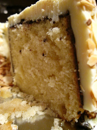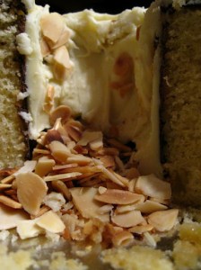 (left: Cross-section of cake. right: An avalanche of almonds! I’d like to be trapped under that!)