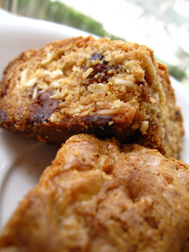 Back to the brownies. Same recipe as the blondies in an earlier post but with an added twist. Another Momofuku spinoff is the “Compost Cookie” – a baked good that includes everything including the kitchen sink! Traditional cookie mixins are a must, as well as your favourite salty nibbles (pretzels, goldfish, whatever!)…rumor also has it that coffee grounds are an ingredient as well! I omitted the coffee and the salty bits but included whatever I could find in my pantry – coconut, dried cherries, white chocolate chips, and almonds. Ahh…I should have added some cereal if I had any left. Good cereal that is. I don’t think my taste testers would enjoy eating a cookie with half a Weetabix protruding from it1