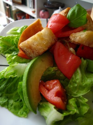 Not a ton of stuff, but definitely enough to kick off my dinner of “Summer Panzanella.” This summer salad is a great way to use an abundance of leftover or plentiful veggies – namely, tomatoes! This Italian salad is also more commonly referred to as a ‘bread salad’ – with stale chunks of bread tossed with veggies and a vinegar-based dressing. What is really terrific about this salad is that it is so…”what you make it”. I went more traditional and used tomatoes, bread, and fresh herbs – but why not add some fruit to the mix? Peaches, strawberries, and oranges would complement the salad well, as well as some grilled asparagus, grilled  peppers, or cucumbers. I actually wanted to do a side raw carrot salad, but ran out of time (shaved carrot strips tossed with lemon juice & olive oil, with lots of salt & pepper!). I came up with a basic panzanella on top off romaine lettuce and avocado.