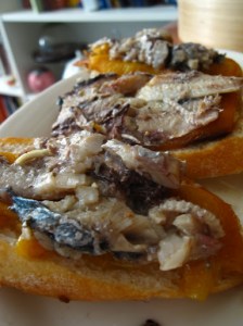 As a side, I prepared a straight knock-off of a dish I had last week at a Spanish tapas restaurant. It was my twist on grilled peppers and anchovies on toast, I made grilled peppers and sardines on grilled toast! This super-simple side is a perfect complement to a salad – it’s got the substance with the bread and the savoury protein element. Unfortunately the sardines aren’t quite a nice out of the can as anchovies, and I had to add quite a bit of lemon juice to kick up the flavour.