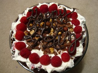 I kept in mind that Liz adores my zuccotto – so the ‘white’ filling is comprised of whipped cream with fresh raspberries, toffee candy bits, and whole toasted hazelnuts folded in. The over-powering brown layer is an orange chocolate mousse (I didn’t realize I had made so much & didn’t want leftovers!). The layers are alternated with dark chocolate and vanilla cake. The whole shebang is topped with more whipped cream filling, raspberries & some decorative writing.