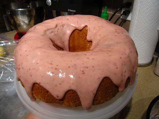 I finished the cake (which came out BEAUTIFULLY golden brown) with a quick strawberry jam-based glaze. It looked like a giant donut – but just a bit more decadent.
