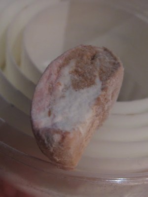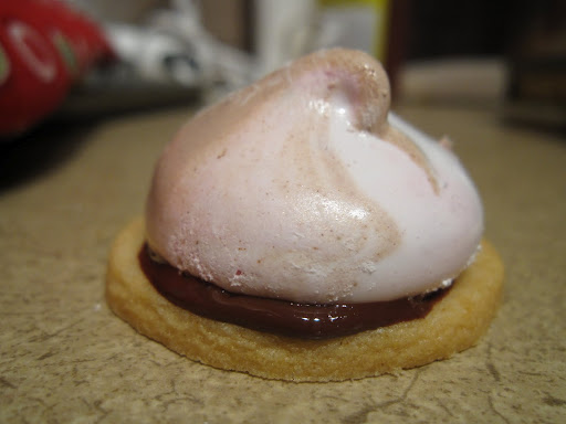 So the method was simple enough: make the generic marshmallow base and then divide into three portions and flavour with strawberry and chocolate. For the strawberry I used some homemade jam and pink food colouring. For the chocolate I used cocoa and espresso powder. I placed a piping bag in a tall cup and folded over the edges for easy filling. I filled the bag in thirds (from the top, around the edge) with the three flavours and held my breath. I had no idea how the flavours would settle, but they turned out pretty tasty! It’s pretty neat how the colours marbled, I piped them into two shapes: long logs to cut up later and “kiss” shapes to top cookies.
