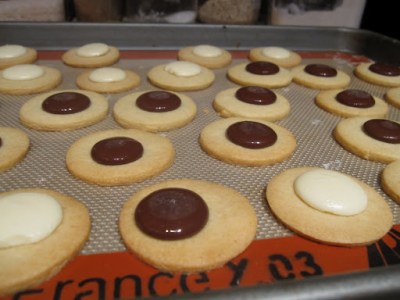 I made a basic sugar cookie dough, cut out small rounds, topped each round with a dark chocolate or white chocolate callet and then plopped a marshmallow kiss on top. And the results? Simply divine.