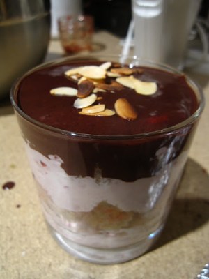 Using the scraps of the cake, I built a small cup-sized trifle. I had a date coming over a few days later and wanted to serve this as a dessert. I layered the cream, cake, toasted hazelnuts, and ganache in a whiskey tumbler and added some slivered almonds as a garnish.