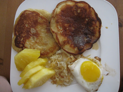 I actually made the pancake batter (thanks Joy of Cooking!) and added walnuts in for an extra crunch. He cooked them while I made us coffee. He wanted other breakfast goods as well so he prepared hashbrowns and eggs (and maple bacon for him) as well. I added the pineapple as a tropical garnish!