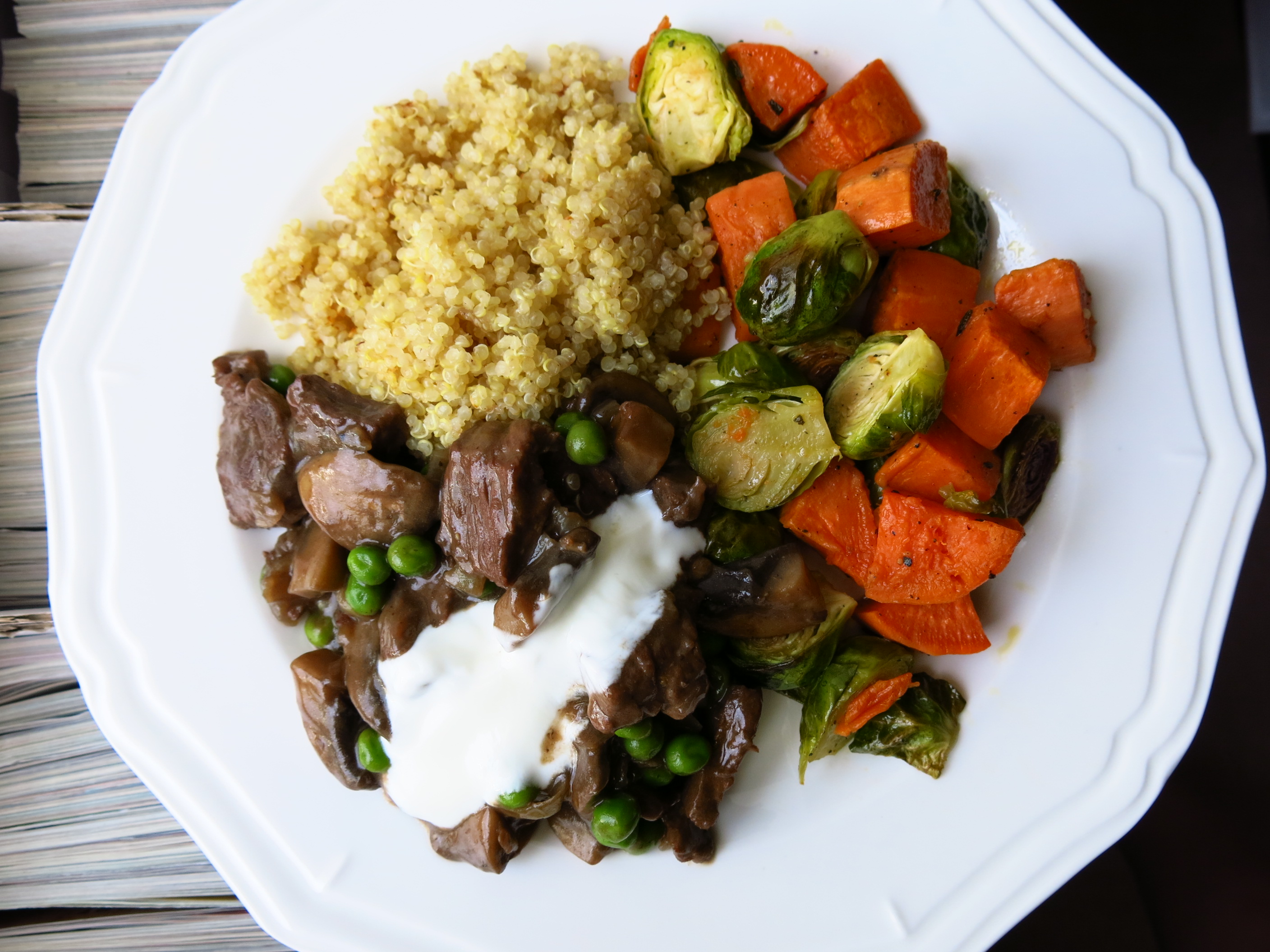 One of these meals was a mega-sized beef stroganoff (I live alone so my big batches do go a long way) with a side of roasted yams & brussel sprouts, served with quinoa.