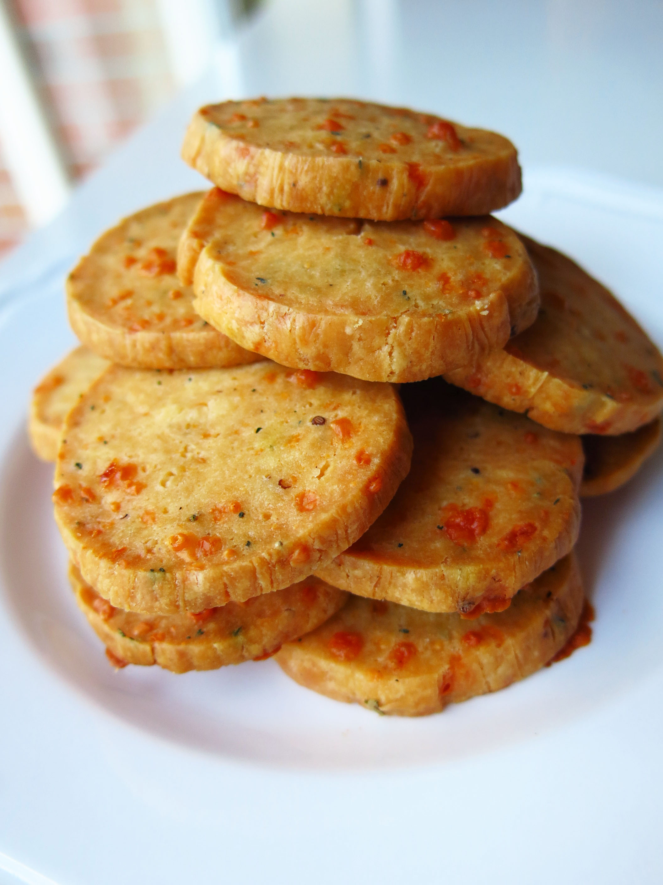The concept was pretty simple – process softened butter, cheese and a few ingredients and then add in flour. I didn’t soften the butter long enough so it didn’t come together in the food processor very well – so off in the mixer it went! My note to people who want to try this recipe is to be more generous on the salt if you use a milder cheese. I used a strong cheese but I shouldn’t of held back. Also! Slice them a bit thinner than the recommended 1/4″ for a snappier cracker!