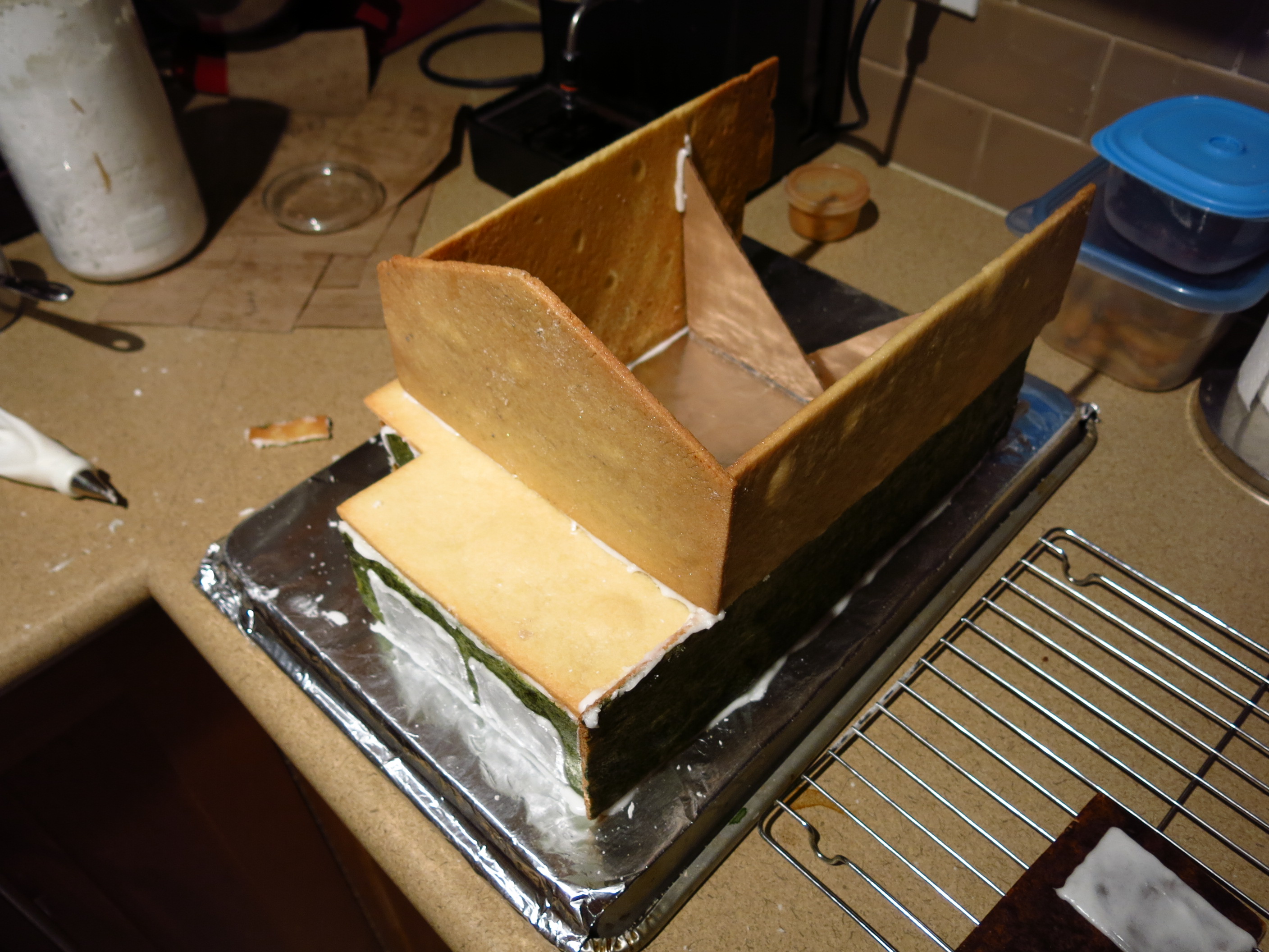 The interior supports (hot glued to a foil wrapped sheet pan) – you can also see the cookie carnage and microplane standing by.