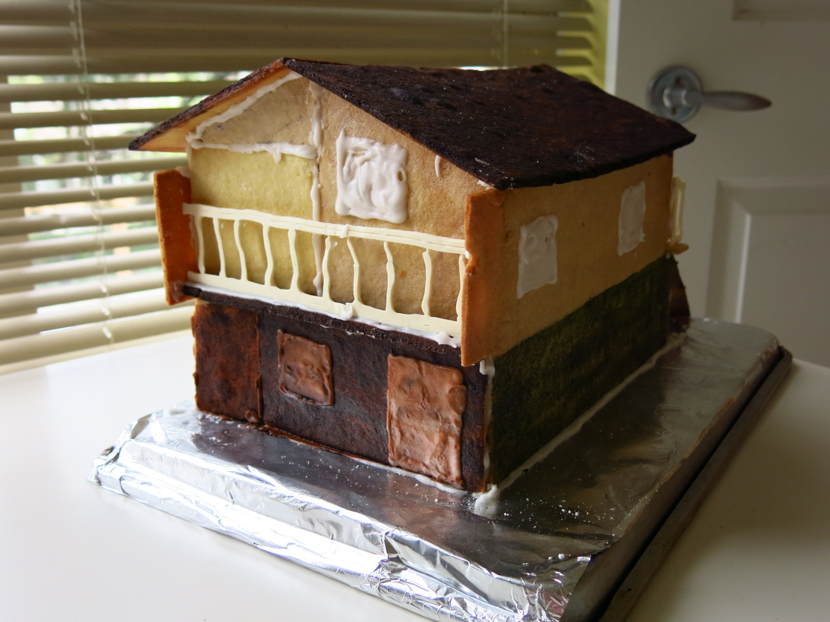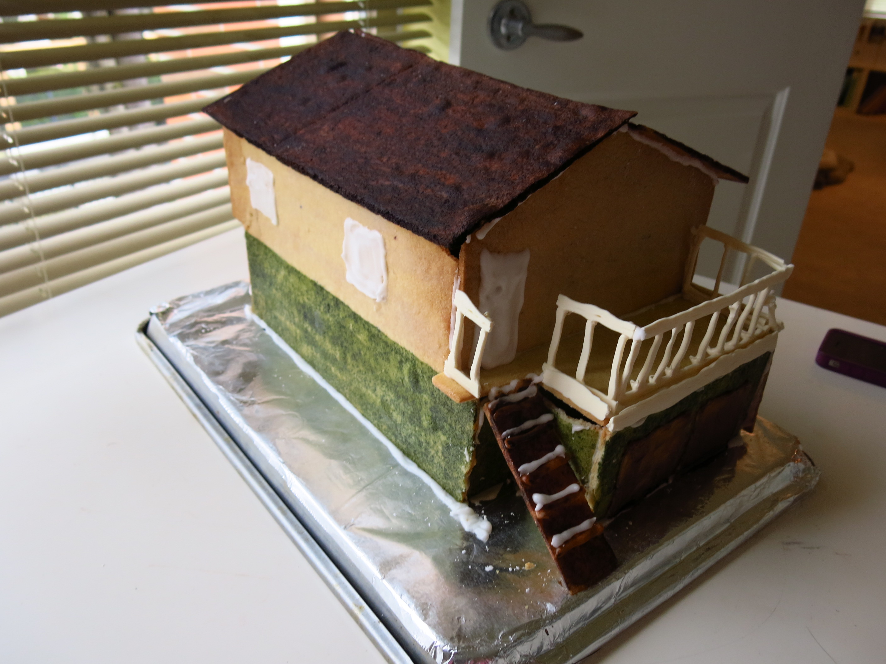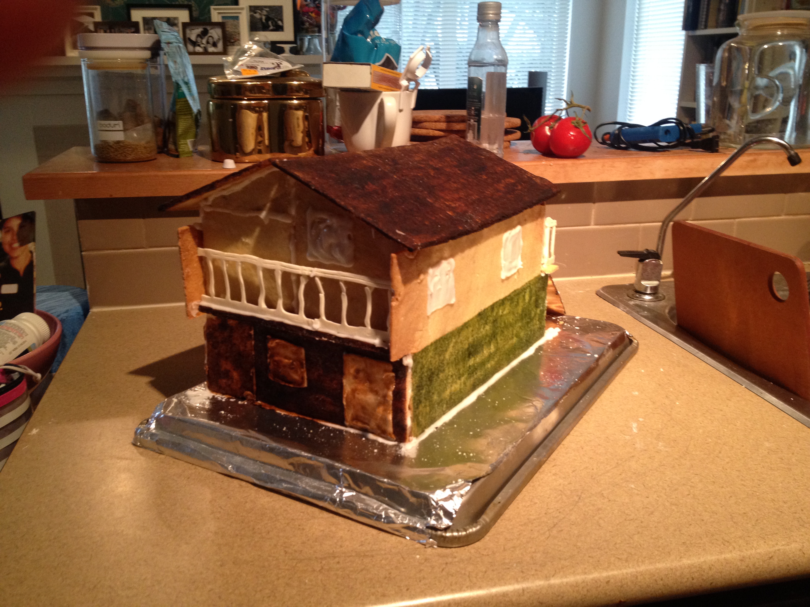 The next day, I prepared the banisters (white candy coating, piped) and carefully lowered the roof onto the house… and ta da! My Vancouver Special was done! It was way messier than expected. Obviously if I could trial run it, I could have made a damn good second version of this house, but overall, I’m pleased with my effort. I was actually really satisfied with my approach and was glad that I did take time to plan out the blueprint of the house before going buck wild and cutting out dough (my usual instinct). I was actually kind of methodical!