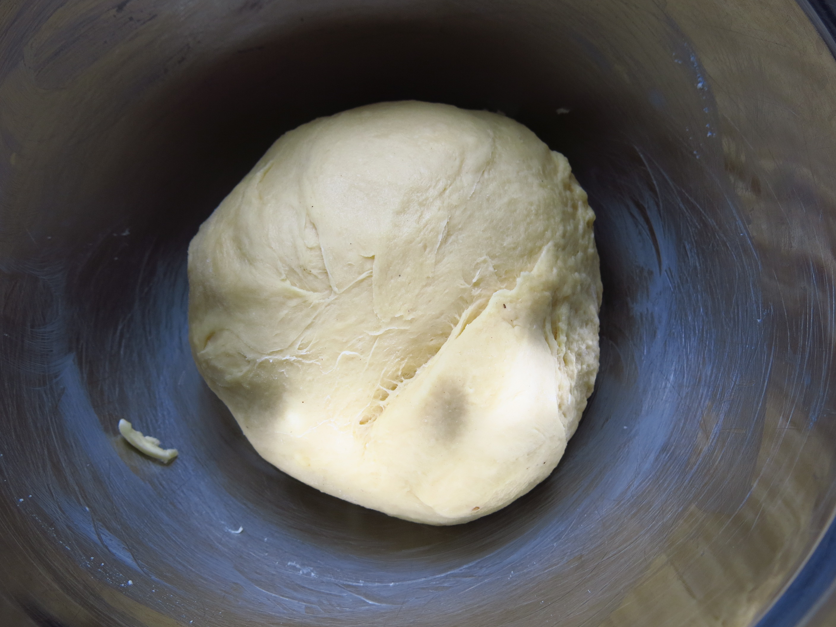 The dough is pretty basic until you get to the butter part…You switch to a hook attachment (not the best for incorporating butter) and you start adding in the butter bit by bit. It takes a bit of time (as warned) and I had to give some stray butter globs a little nudge to join their buttery compatriots in the dough…but it gets there! And after a further knead (thank goodness for Kitchen Aid mixers) – you get a beautiful dough: