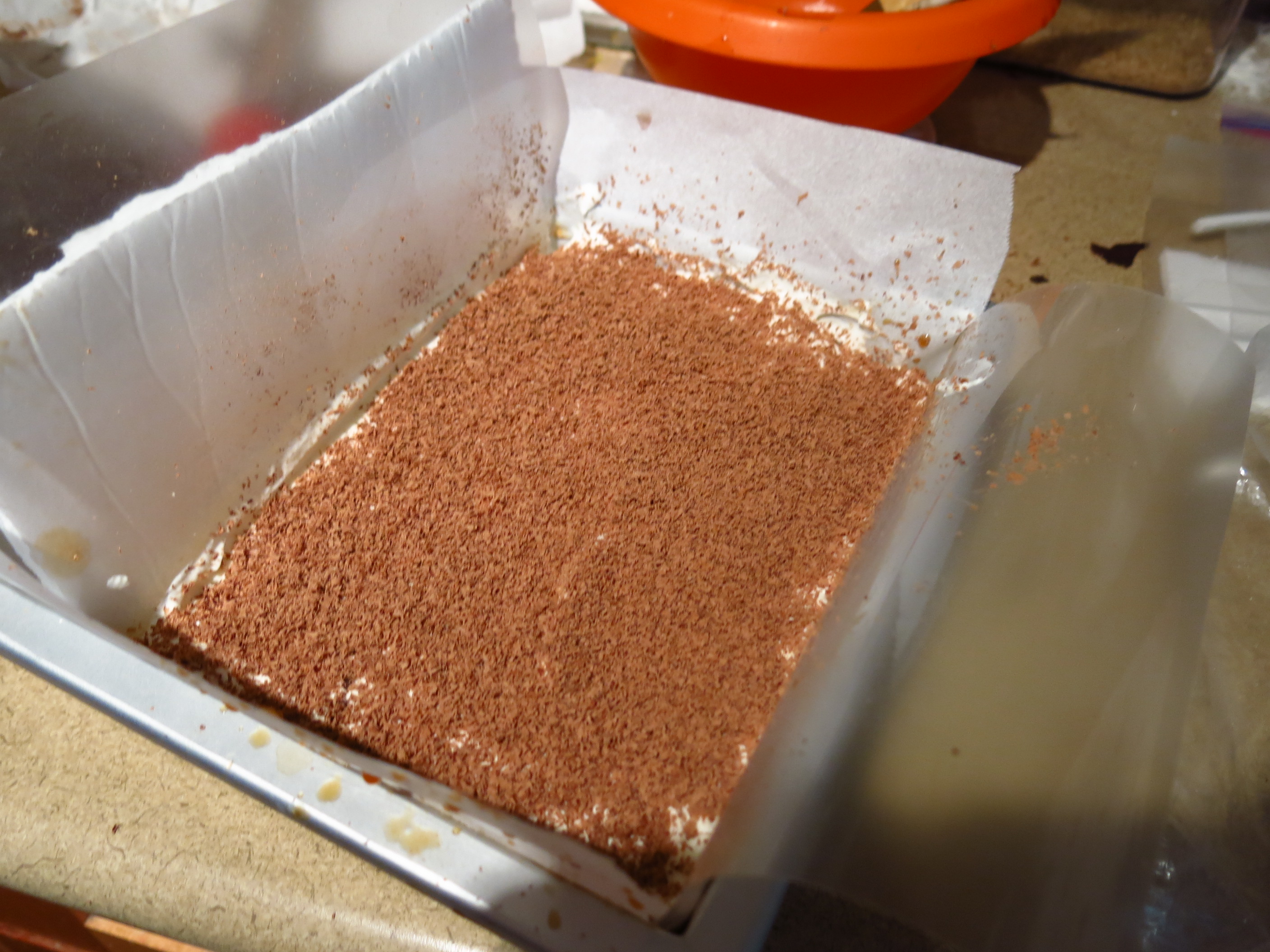 The layering was like this: cake + syrup + filling + chocolate + cake + syrup + filling + chocolate + cake + syrup + filling + cake + syrup + filling + cocoa powder. Here we are at a chocolate stage of the cake…