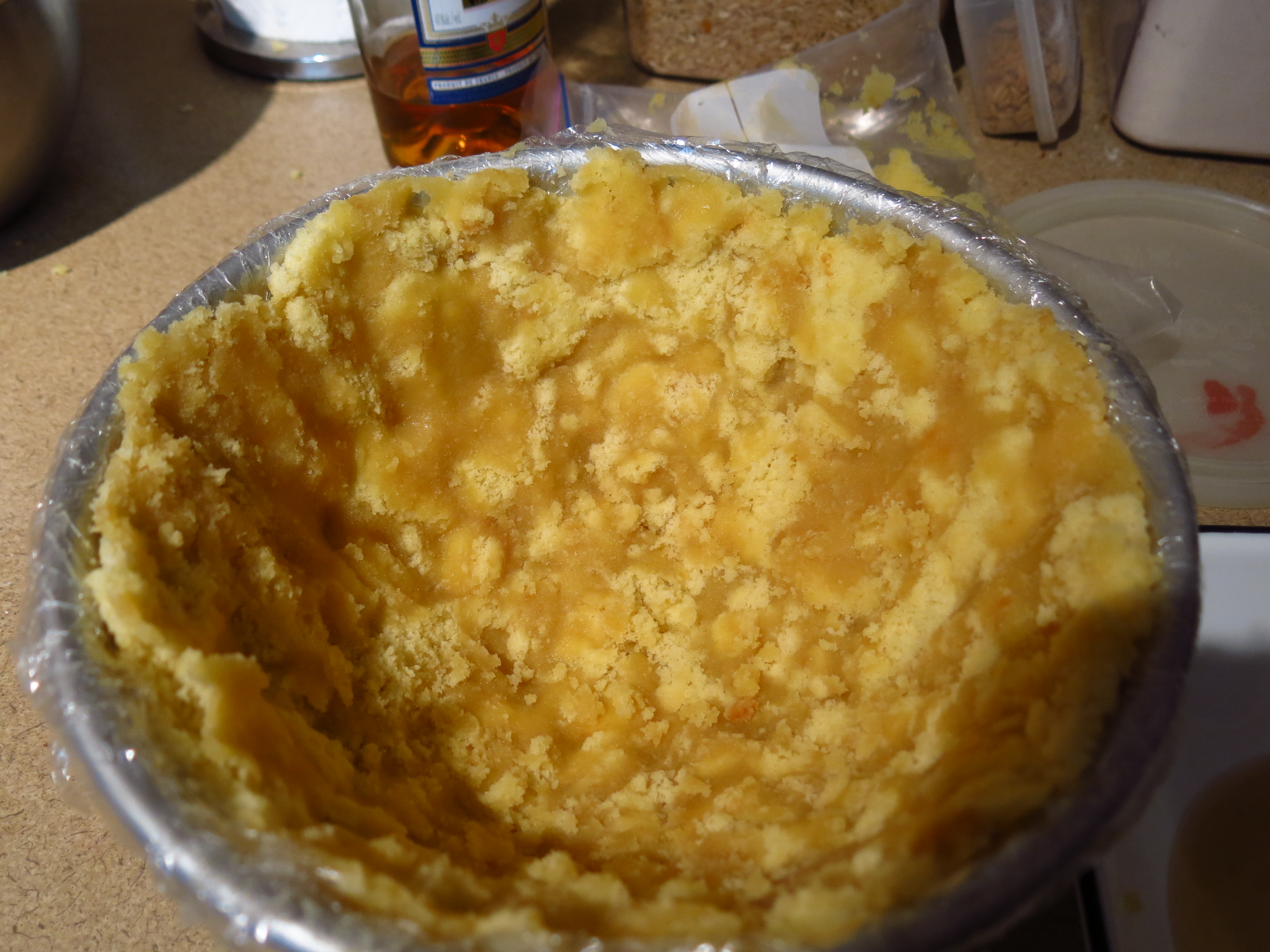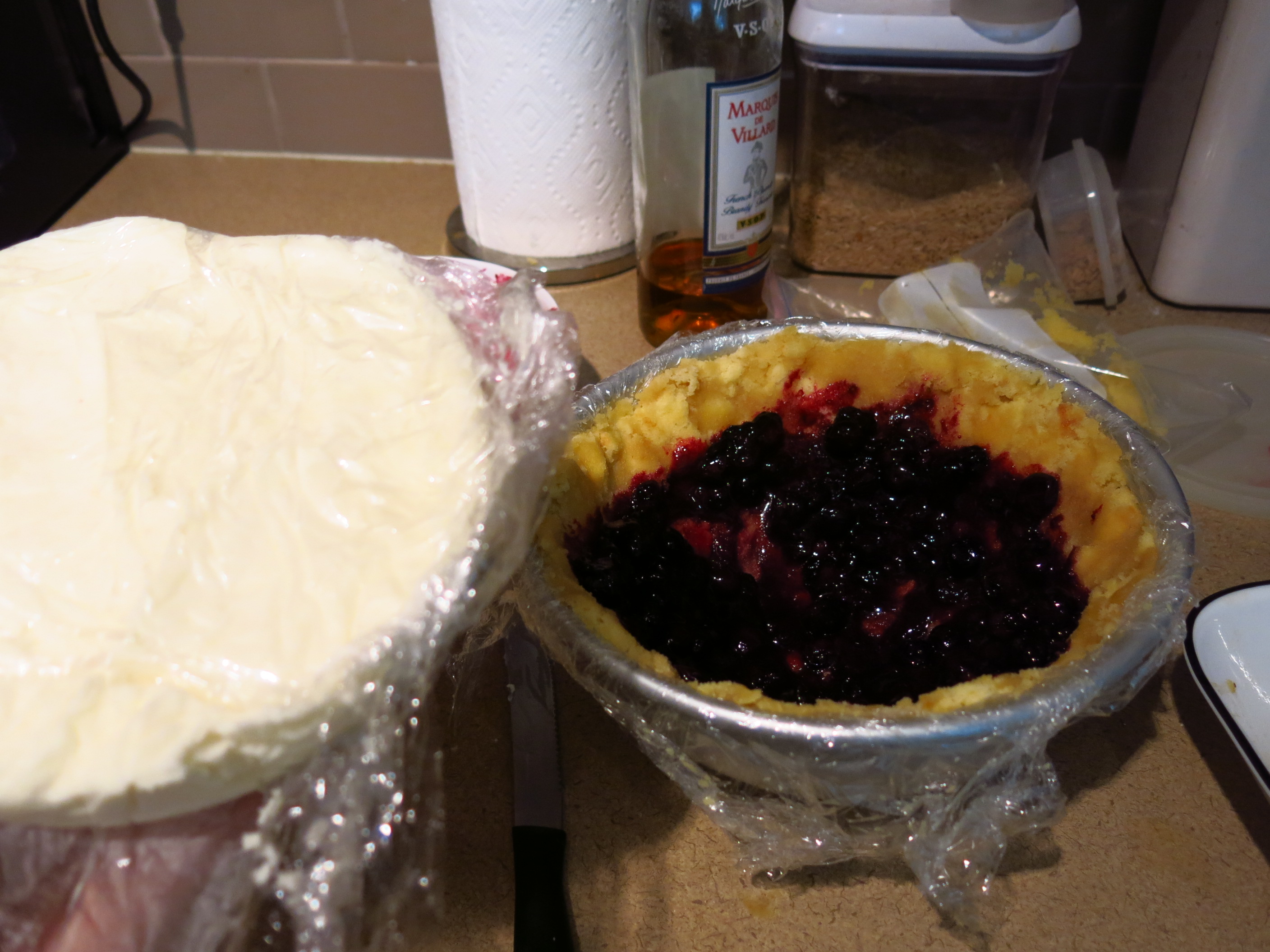 When I came home, I knew that this dessert would be the inspiration to my Baked Alaska. The sorbet would be the ice cream, I would make a coconut crunch layer, a blueberry element and then the meringue would be the creamy component. It was off to the races to start building the components – up first, the sorbet! I juiced a whole fresh pineapple, made a simple syrup and added 1/4 cup of lime juice for the sorbet. It works out to be about 2 cups of juice + 1.5 cups syrup. The final result was very light and smooth – not sure if I aerated it too much. I used a bag of vanilla cake scraps to build the “shell” of the dessert. I finally got to use the 8″ and 6″ round cake domes I purchased in NY last year! So the 8″ cake dome was lined with saran wrap, then lined with booze-soaked cake (brandy). I made a very quick blueberry compote (just the fruit, no sugar) that went inside the cake-lined dome and then carefully slid the 6″ dome of sorbet on that, pressing gently to get the compote all the way around.