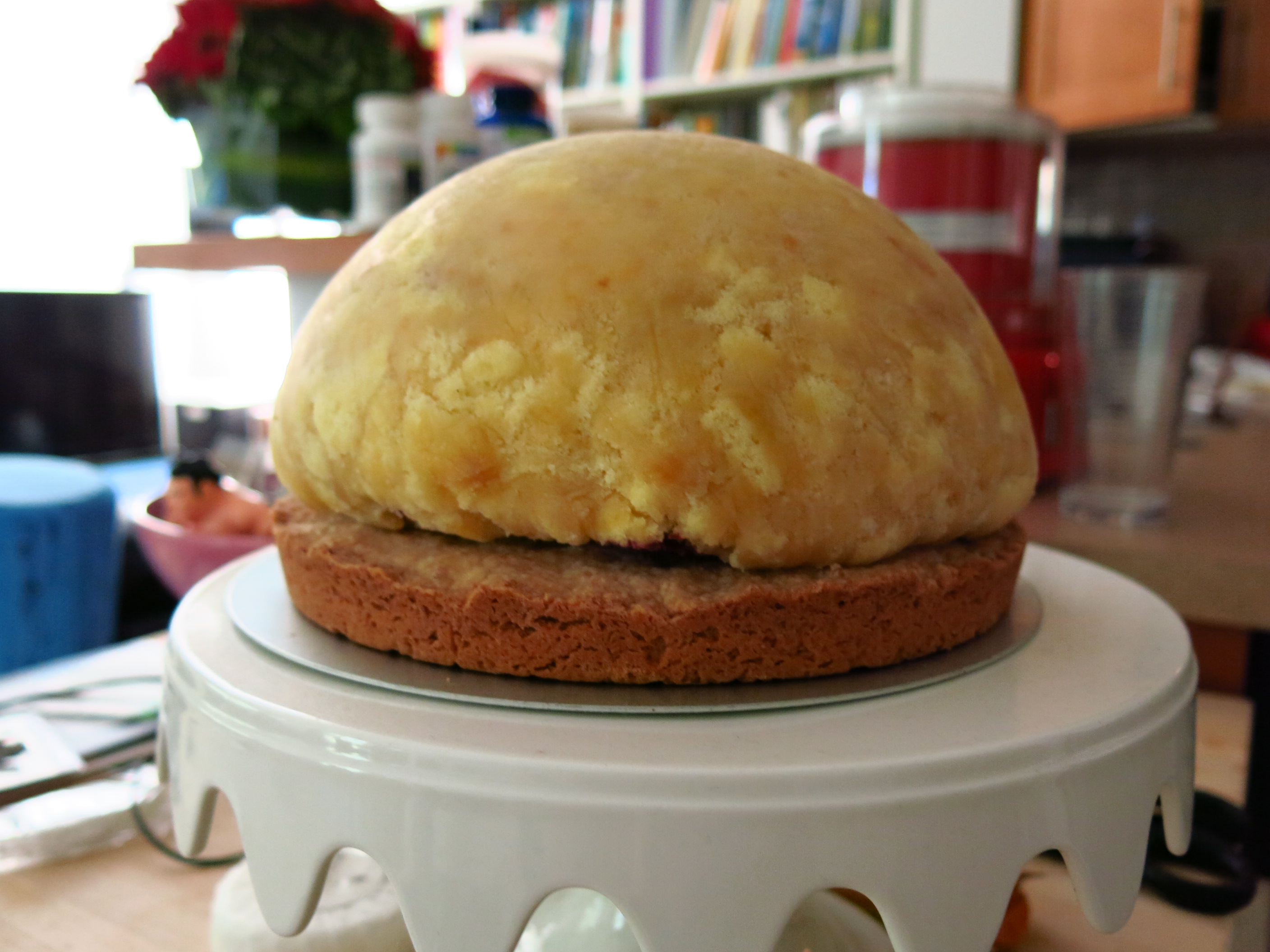 Compote on the cake and the sorbet round (unmolded from the 6″ dome) ready to be placed.