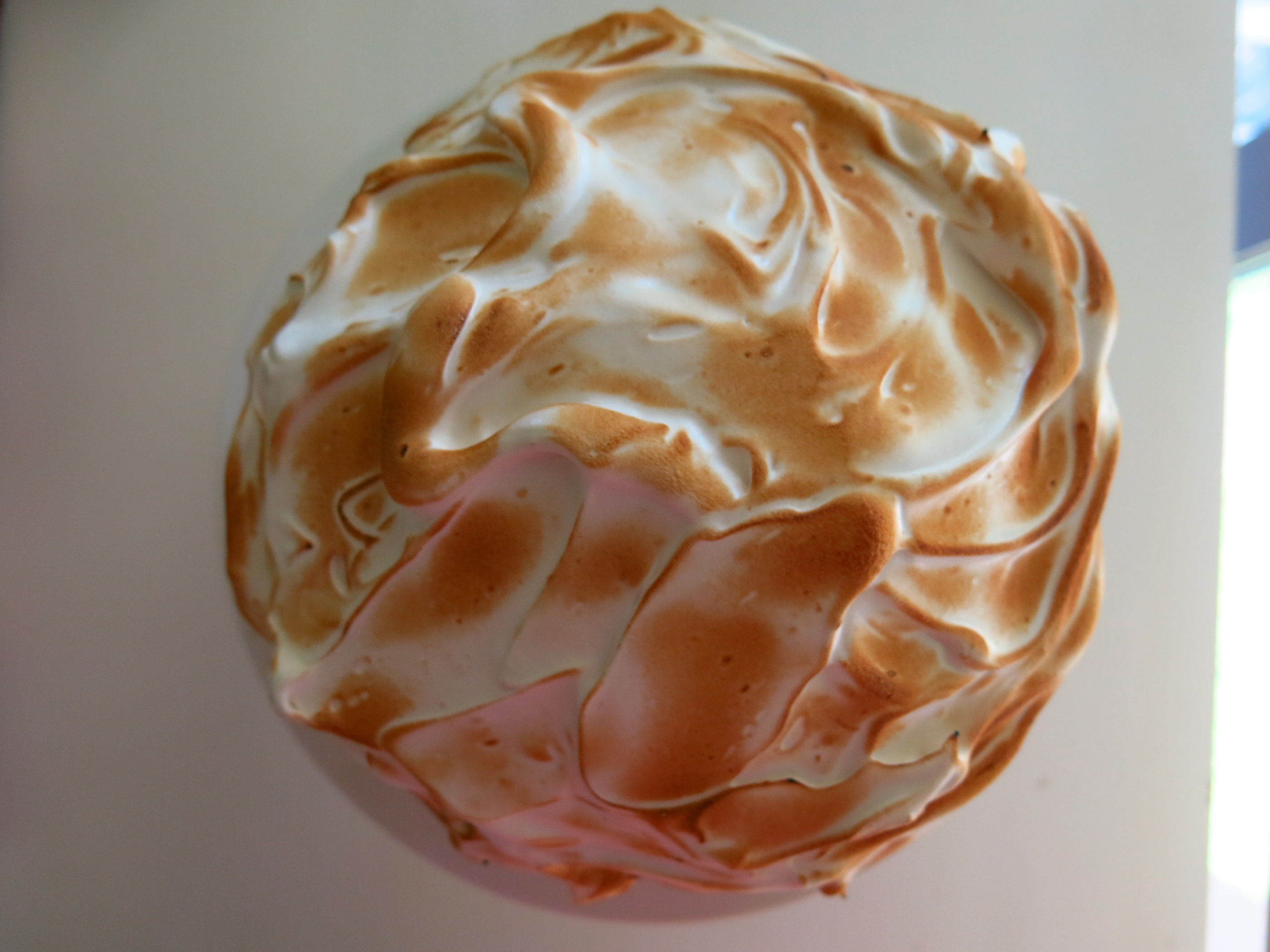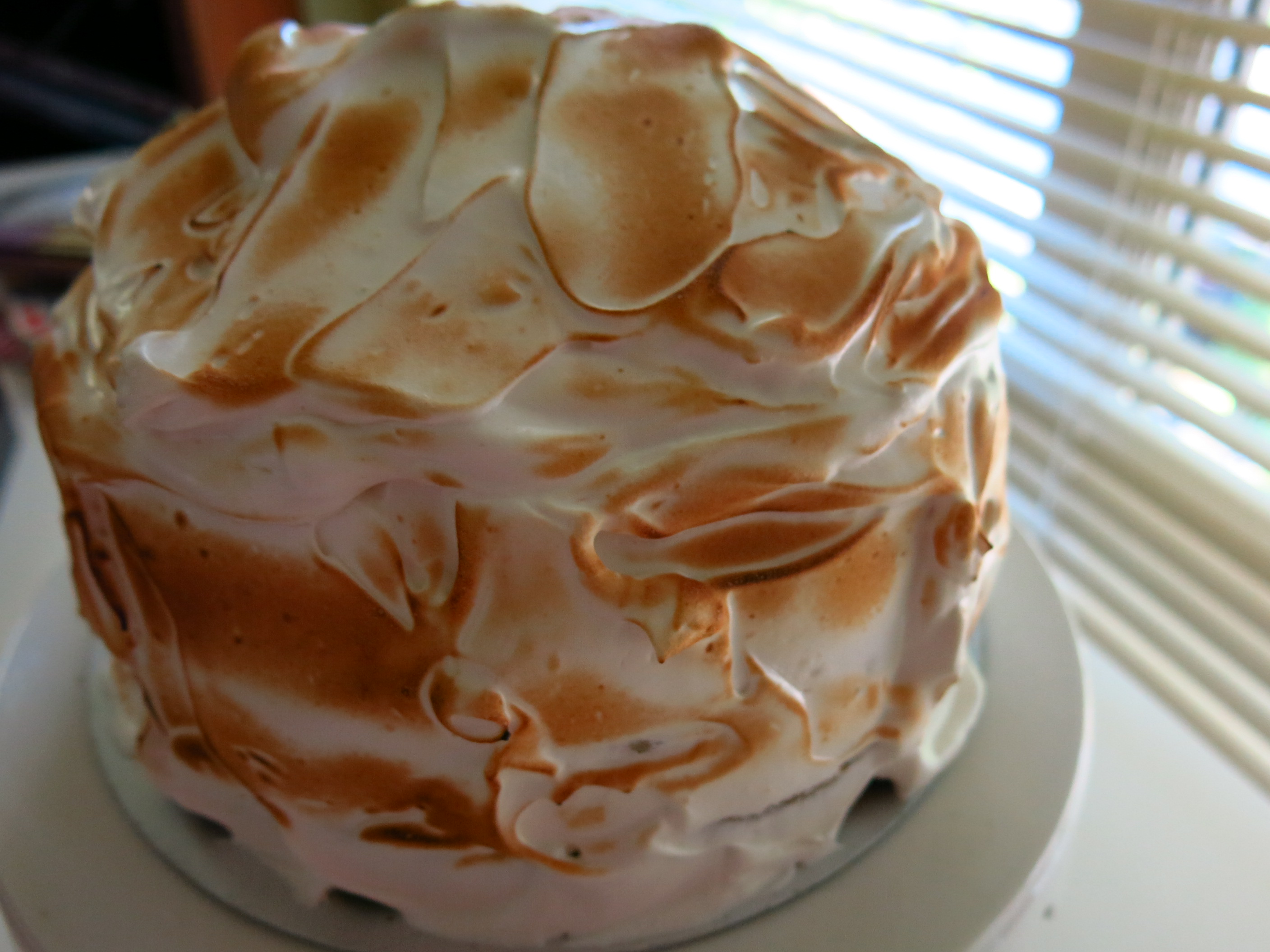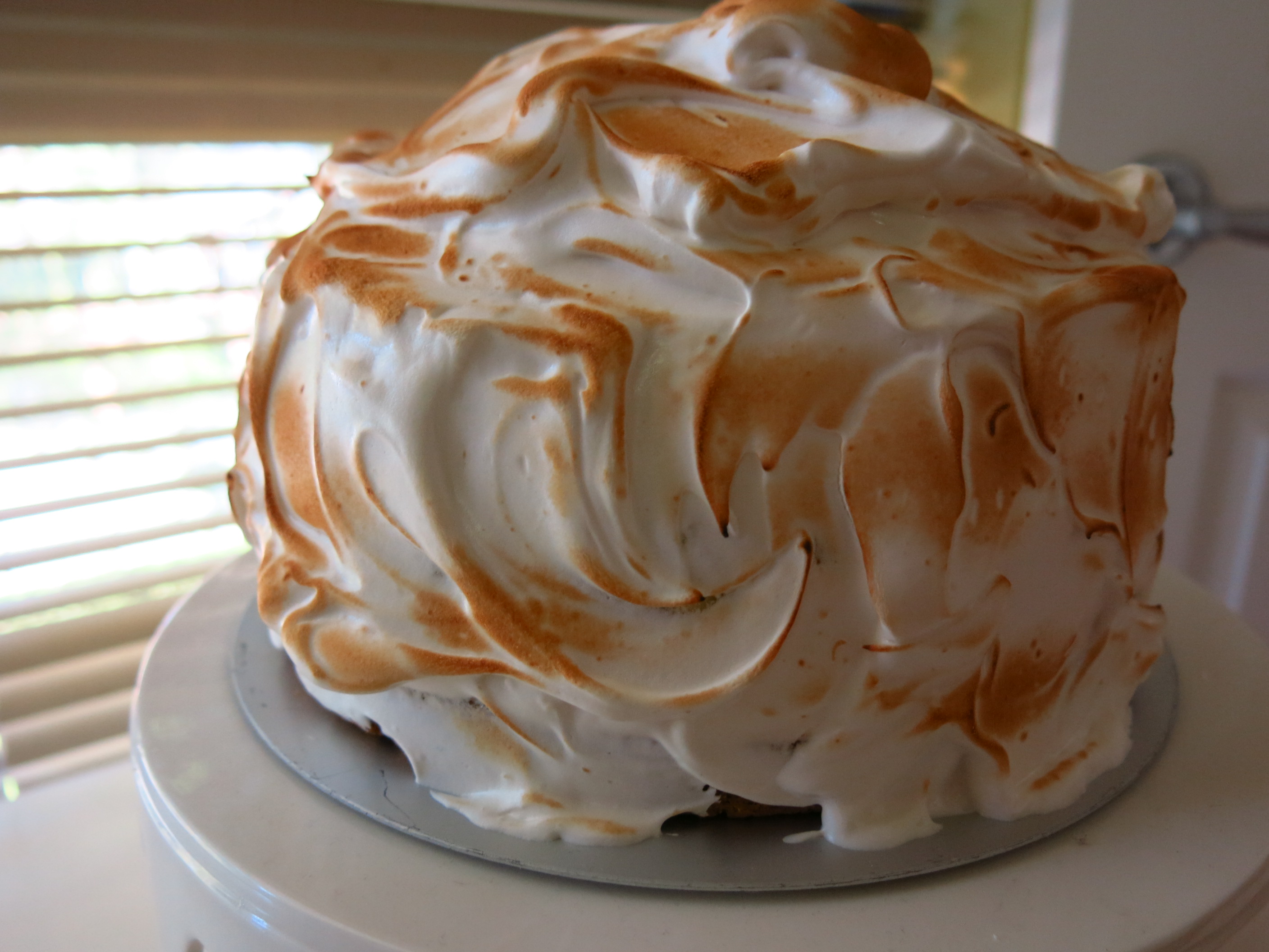 I made a coconut shortbread cake base – which in retrospect is a little tough to cut when frozen but was nice and crunch (and coconut-y!). I made a standard boiled meringue frosting and torched that baby!