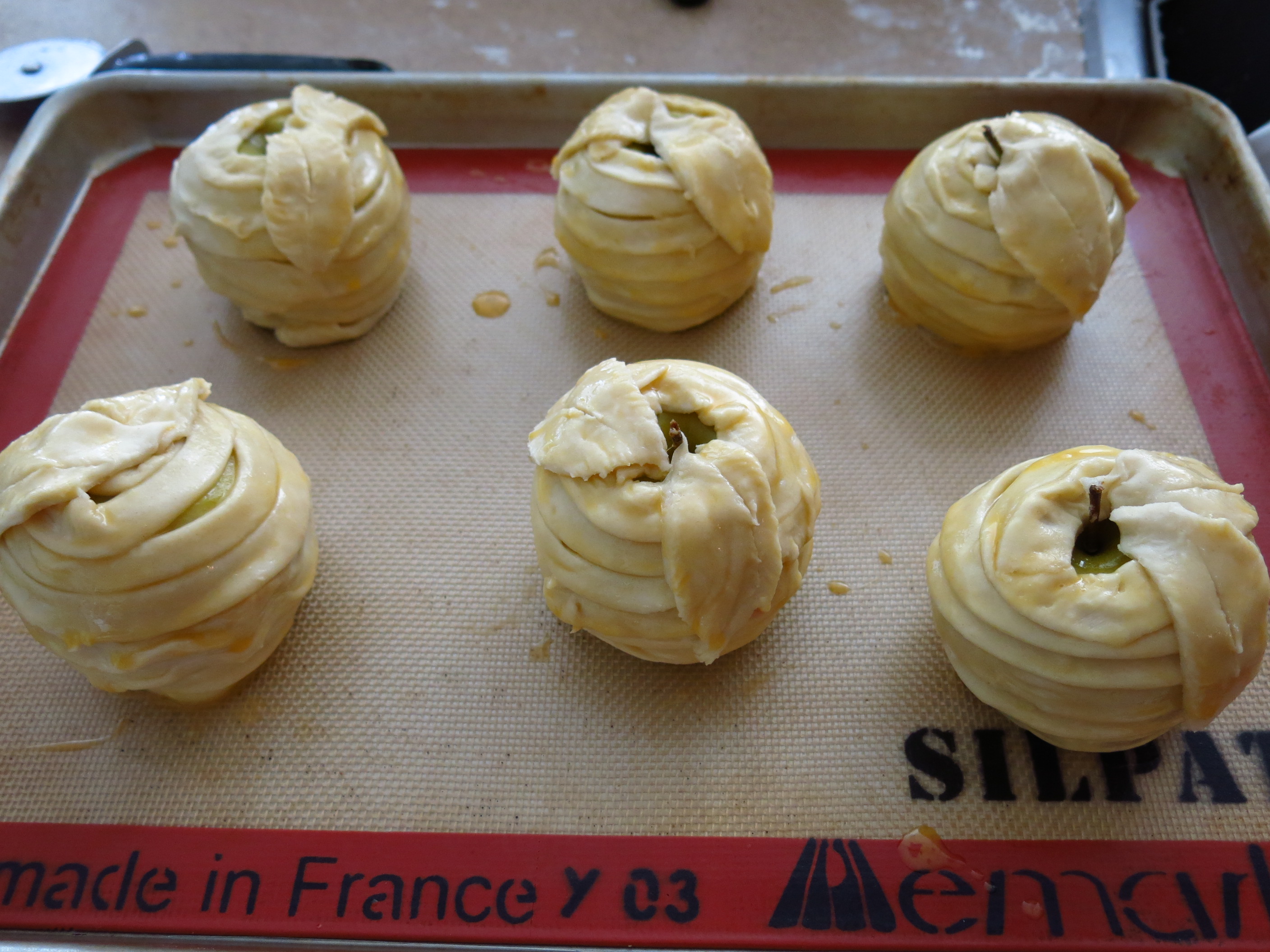 Once the apples/fruit are cooled, you roll out the pastry and cut it into strips. These strips will be wrapped, mummy-style, around the fruit. I didn’t find this too challenging, however I just found it kind of unattractive. Anyway, after you’ve wrapped your fruit, you apply a couple of pastry decorations, glaze with an egg wash and bake to golden-y goodness.