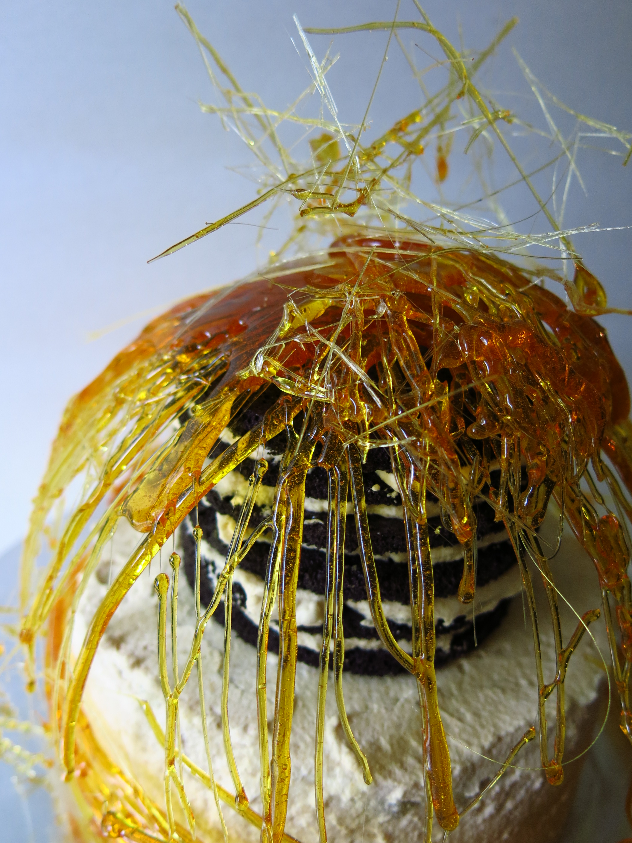 Do you know what a Dobos Torte is? Yeah, neither do I. Or rather, neither DID I. I had to do some research to figure out this Technical Challenge. The Dobos Torte is a multi-layered cake with a lot of caramel garnish. The emphasis here is on the caramel work, which is where I concentrated my efforts. I wanted to do an Eastern twist on flavors so I made a green tea layer cake with kinako filling and then a smaller black sesame layer cake, also with kinako filling. And then caramel – lots of it!